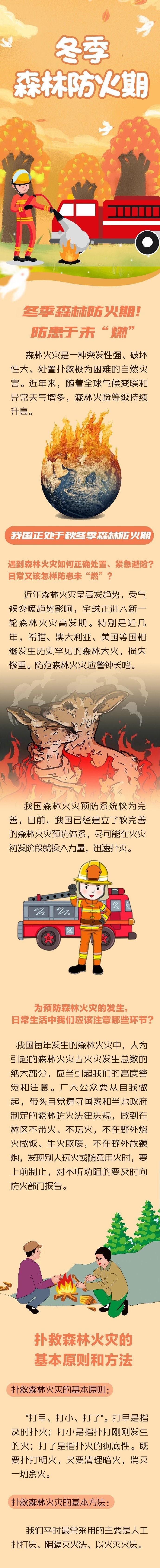 森林火灾是一种突发性强、破坏性大、处置扑救极为困难的自然灾害。近年来,随着全球气候变暖和极端天气增多,森林火险等级持续升高。遇到森林火灾如何紧急避险?预防森林火灾发生该注意哪些环节?戳图了解↓